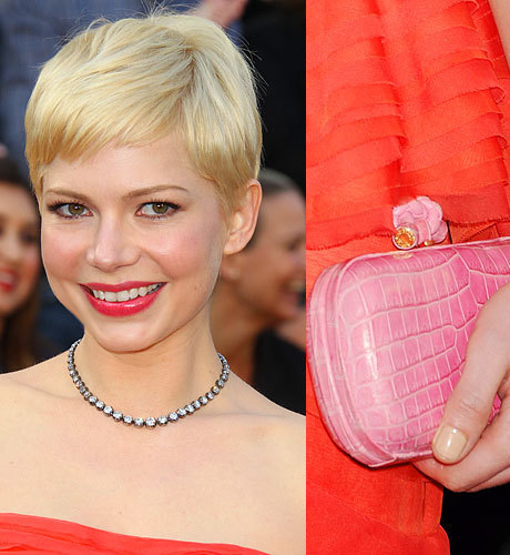 Актриса, прославившаяся благодаря роли величавой Мэрилин Монро, успешно «играет» с цветом. Мишель искусно соединяет платьице цвета кораллов с малиновой помадой и розовым клатчем. Смелое решение!