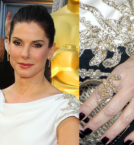 Сандра выделила глаза карандашом и добавила мерцающих теней, чтоб они перекликались с ее украшениями. Волосы актриса затянула в конский хвост, а на губки нанесла сияние с золотистым переливом. Маникюр Баллок сделала в цвет подола платьица.